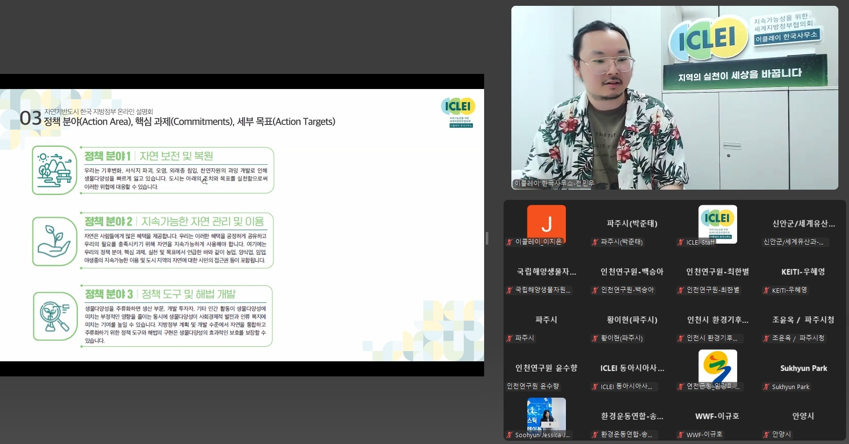 이클레이 한국사무소는 지난 7월 23일 이클레이 한국 회원 지방정부를 대상으로 “자연기반도시(CitiesWithNature) 온라인 설명회”를 개최했다. 본 설명회는 지난 4월 이클레이와 경기도가 개최한 2025 세계 지방정부 기후총회에서 부대행사로 진행된 자연기반도시 한국 지방정부 역량강화 워크샵에 참석하지 못한 한국 지방정부를 위해 온라인으로 진행되었으며, 약 30여명의 지방정부 공무원, 연구원 및 환경단체 실무자 등이 참석하였다.