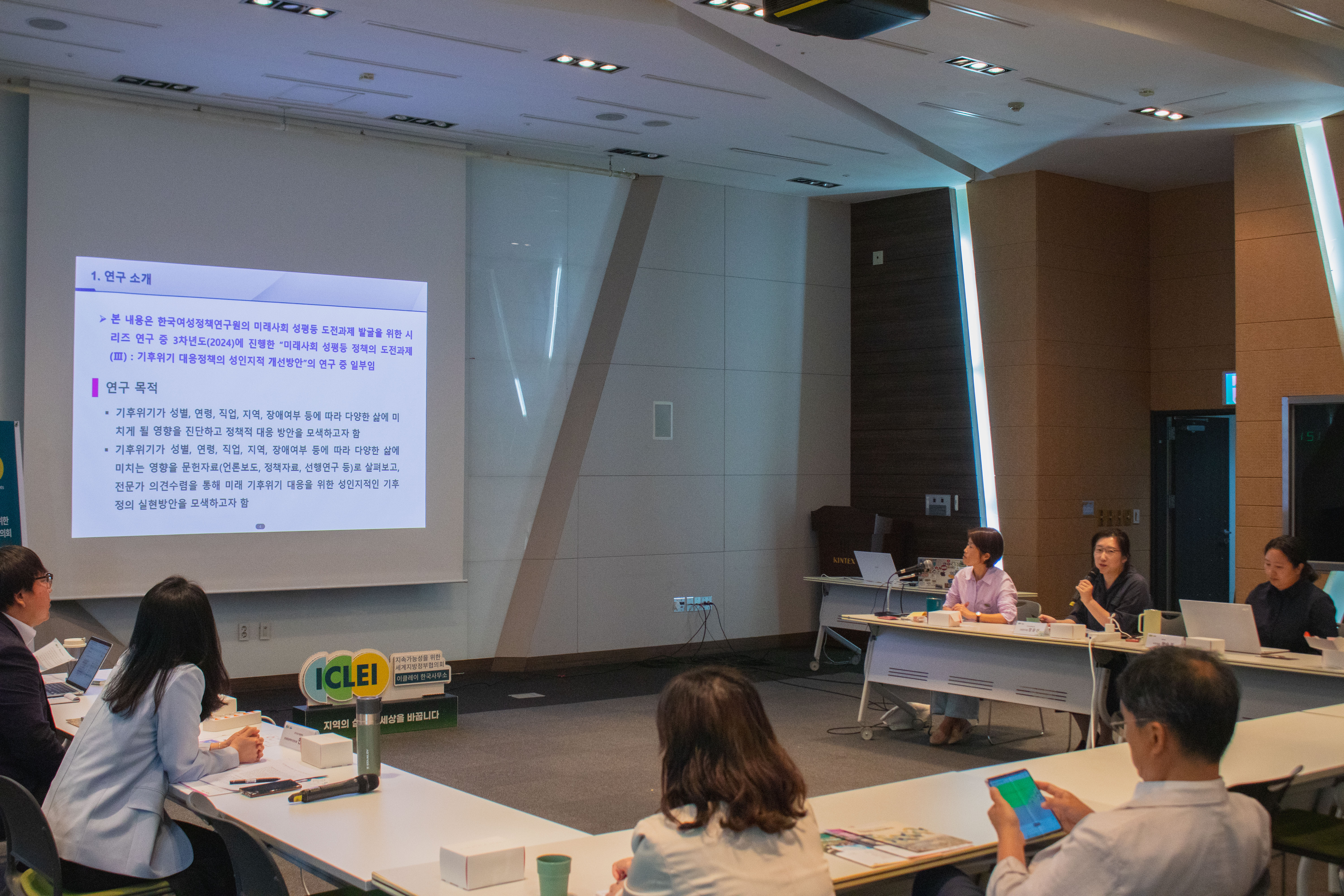 민소담 경기도 양성평등정책추진전문요원은 이클레이가 진행한 분석 내용을 사업에 참여한 사람들과 직접 논의할 수 있는 자리를 마련하여 정책 결정자와 이해당사자가 성평등 관점에 대해 생각해 볼 수 있는 기회를 마련하는 것이 중요하다고 제언하였다. 특히 현재 시행하고 있는 위원회 성비 평가 및 성별영향평가를 환경 분야로 확장하여, 환경 및 젠더 관련 부서의 공직자 교육 및 역량강화를 통해 지방정부 환경정책의 성인지적 접근을 시도해 볼 수 있을 것이라고 전했다. 민소담 전문관은 환경부에서 성별영향평가 컨설턴트로 실무를 진행한 경험을 통해 자연기반해법 정책 지원 사업이 최대의 생산성을 도출하는 자본주의적인 구조로 작동하는 것에 대한 근본적인 고민이 필요하다고 지적했다. 특히 환경에 해로운 영향을 미치는 생물다양성 사업(농수산임업 등)에 예산이 책정되고 사용되는 경우가 많아 이를 사전에 평가하고 논의할 수 있는 방안을 마련하는 것이 필요할 것으로 보인다.