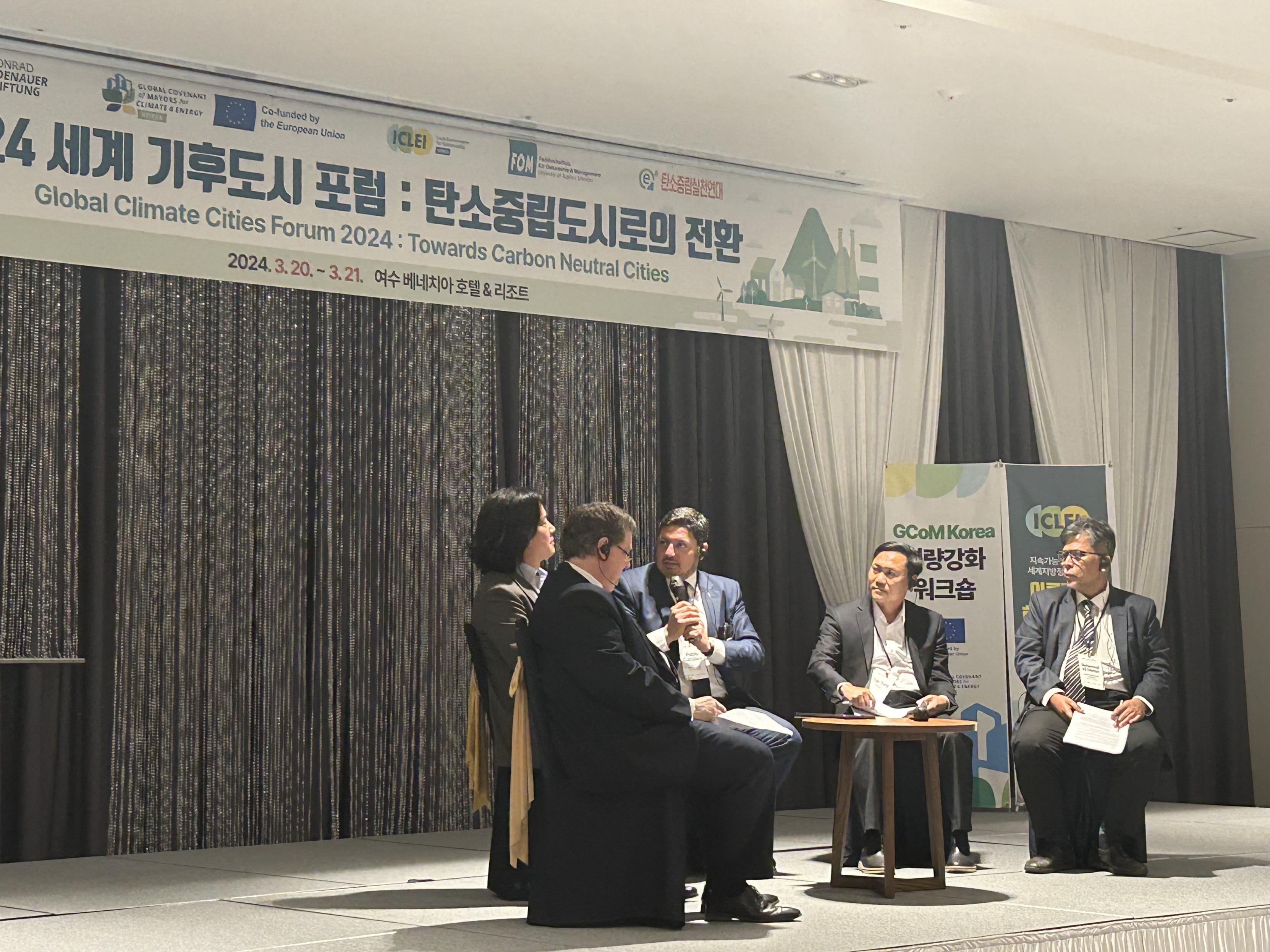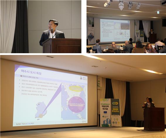 이어 여수시 탄소중립지원센터에서 여수시의 산업 및 주민 참여 분야 에너지 전환 정책을 설명했다. 여수시는 국내 최대 종합 석유화학 산업단지인 여수국가산단을 보유한 곳으로 친환경·저탄소 산업단지로의 전환 추진 방안이 끊임없이 주목되고 있는 바, ‘에너지 자급자족 인프라 구축사업’, ‘수소배관망 구축사업’, ‘해상풍력 단지 조성’ 사업 등 구체적인 여수시의 정책 전략이 소개되어 참가자들의 큰 호응을 얻었다. 이후 좌장인 Pablo Gandara GCoM 아시아 프로젝트 팀장의 진행으로, 발표에 대한 추가적인 설명과 질의사항들이 다루어졌다.