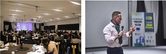이어 포럼 현장에 참석한 전라남도 정찬균 동부지역본부장, 여수시 김종기 부시장, 전라남도 여수교육지원청 서금열 교육장, 탄소중립실천연대 김영주 대표, 콘라드 아데나워 재단 RECAP Frederick Kliem 소장, FOM 응용과학대학 Andreas Oberheitmann 교수는 포럼 개최에 대한 축하 인사와 함께 이번 포럼이 탄소중립도시로의 전환을 위한 유의미한 지식 공유의 장이 되기를 바란다고 전했다. 이어진 주한유럽연합대표부 Maria Castillo-Fernandez 대사의 축하 영상 메세지를 끝으로 오프닝 세션이 마무리되었다.