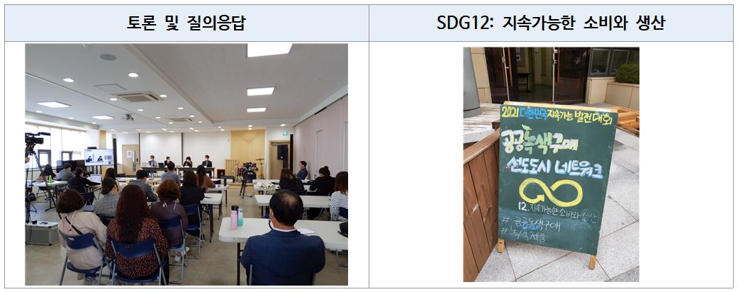 아울러, 토론세션에는 박연희 이클레이 한국사무소장이 좌장으로 참여하고, 방혜원 한국환경산업기술원 녹색전환지원실장, 최병조 세종지속가능발전협의회 처장, 안영신 부산광역시 환경교육산업팀장, 현병옥 전라남도 환경정책팀장이 패널로 참여하였다. 참석자들의 질문을 풀어가는 형식으로 진행되었다.
