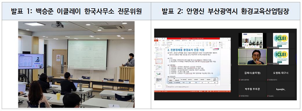 발표는 세 파트로 진행되었는데, 첫번째 파트에서는 백승준 이클레이 한국사무소 전문위원이 ‘공공녹색구매 선도도시 네트워크’운영 사업 개요, 추진경과, 향후 추진 계획을 발표하였다.