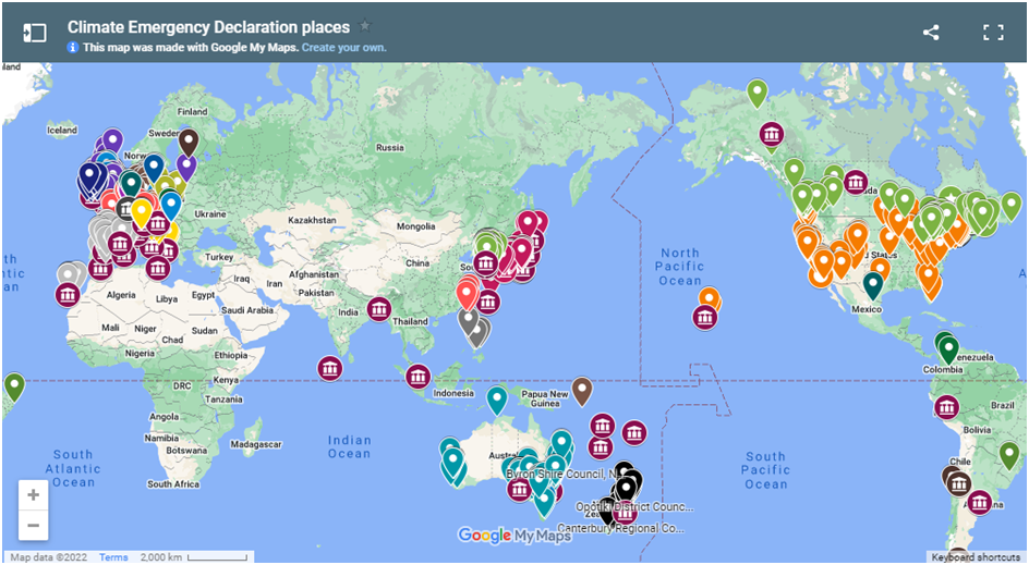 호주 사우스 오스트레일리아 주의 마가렛 핸더(Margaret Hender) 시다미아(CEDAMIA, Climate Emergency Declaration and Mobilisation In Action) 공동 설립자는 ‘기후 비상선언 지도’를 소개했다(https://www.cedamia.org/global-ced-maps/). 이 지도는 39개국 2,200여개의 지방정부의 기후 비상 선언 내용을 시각화하여 보여주는데(2022년 10월 기준), 기후 행동 관련 정보를 한눈에 파악할 수 있어 시민들에게 각 지방정부의 현황을 설명하고 동참할 것을 제안하기에 용이하다.