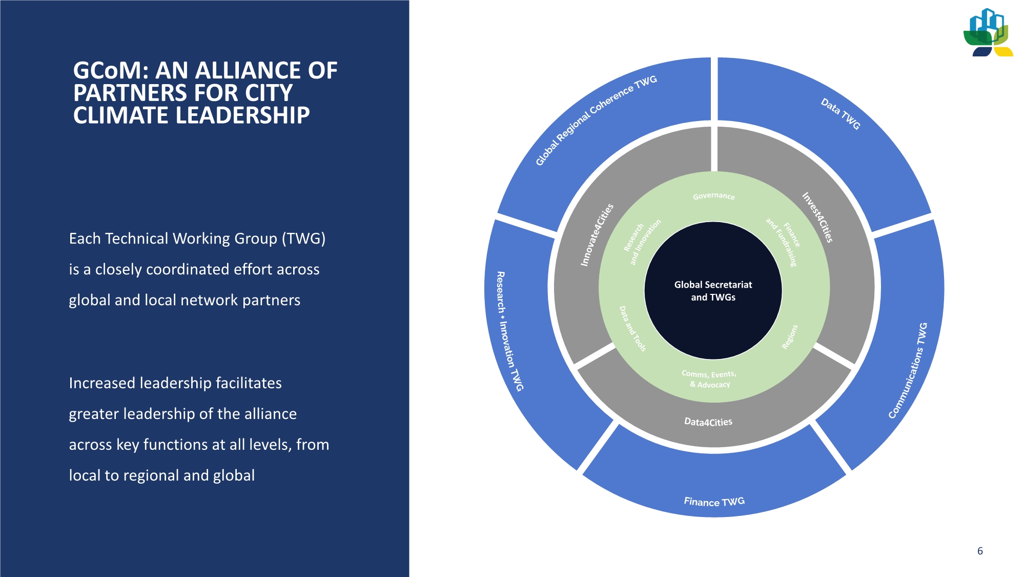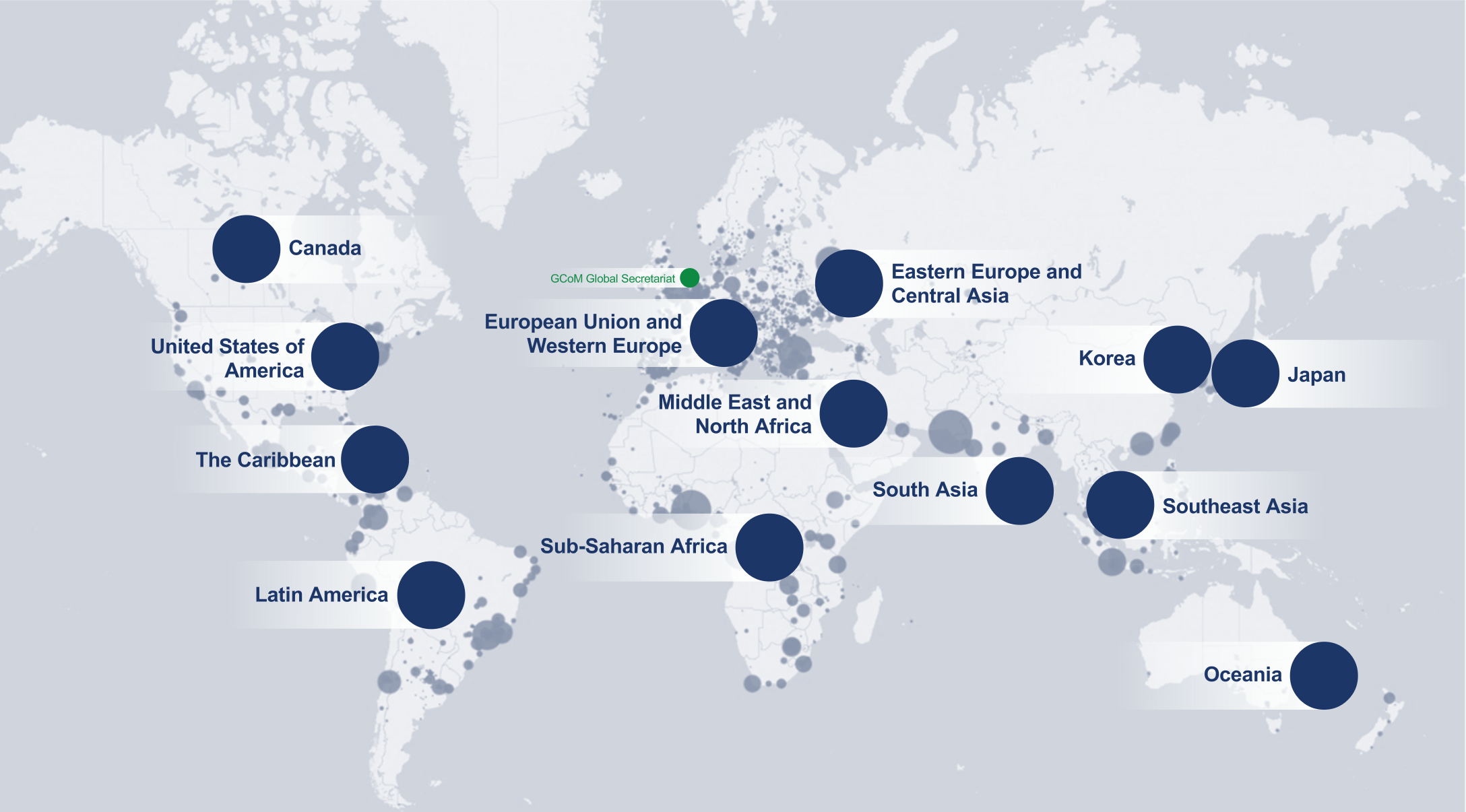 지콤(GCoM)은 글로벌 기후에너지 시장협약(Global Covenant of Mayors for Climate & Energy)의 약자로 기후위기 대응과 에너지 전환을 위하여 도시 시장들이 가입하는 글로벌 이니셔티브입니다. 이전에 존재했던 두 가지 도시 기후행동 이니셔티브인 EU 시장서약(Covenant of Mayors, 2008~)과 시장협약(Compact of Mayors, 2014~)가 2017년에 하나로 통합되어 출범하였으며, 유럽연합과 블룸버그재단이 공동으로 지콤에 재정을 지원하고 있습니다.