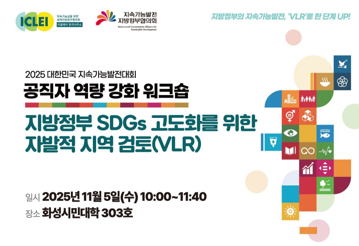 11월 5일(수)~7일(금), 화성시에서 '2025 대한민국 지속가능발전대회'가 열립니다. 이클레이 한국사무소는 대회 첫날, 화성시민대학에서 지역의 지속가능발전 정책을 개선할 수 있는 도구인 VLR(자발적 지역 검토)을 중심으로 '공직자 맞춤 역량 강화 워크숍'을 진행합니다. 화성에서 만나요!