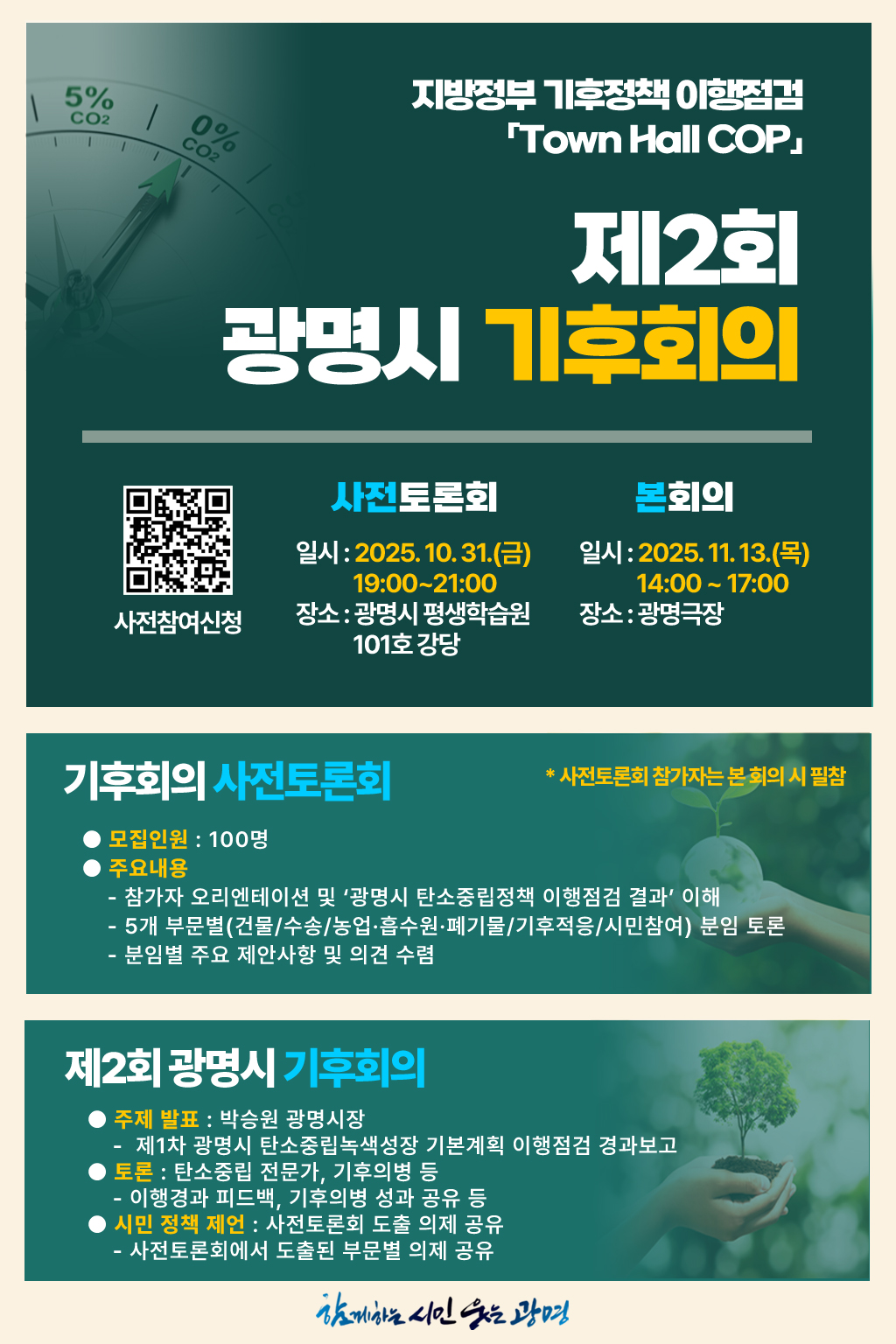 '제2회 광명시 기후회의' 사전토론회는 광명시민을 대상으로 사전 참여신청(아래 이미지 QR)을 통해 이뤄지며, 본회의는 별도의 사전 신청 없이 누구나 참여 가능하다. 지방정부가 지역의 기후정책 이행 결과를 투명하게 공유하고, 이에 대한 논의에 전문가와 시민이 함께 참여하는 의미 있는 자리에 여러분의 많은 관심과 참여를 바란다.
