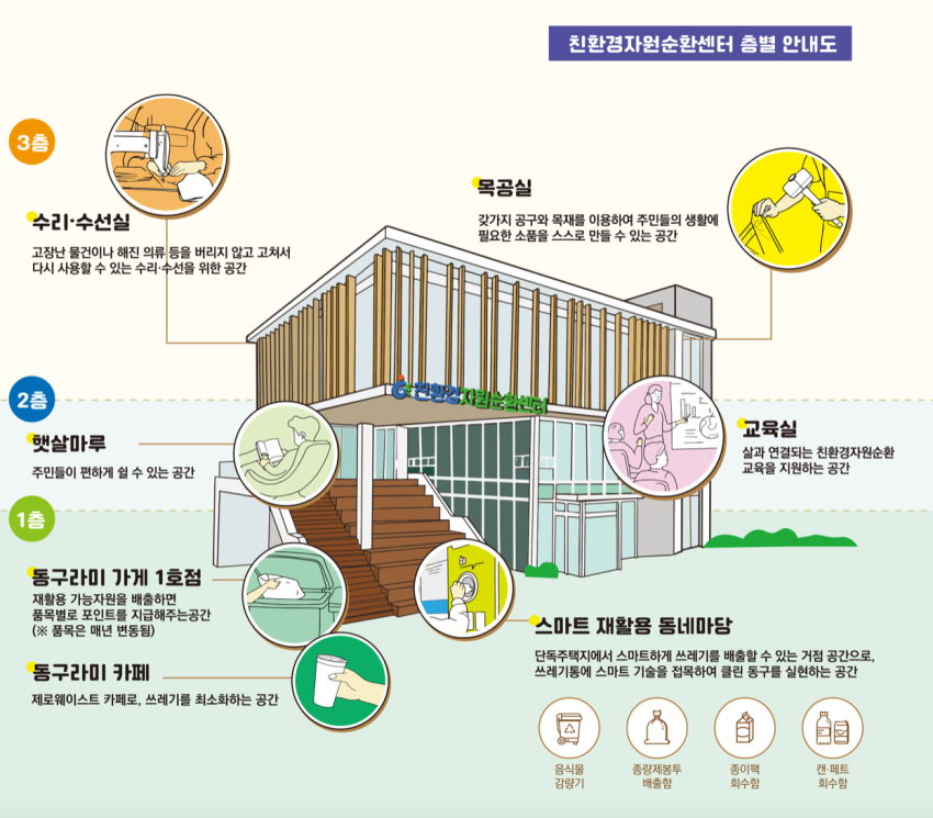 친환경자원순환센터 1층에는 ‘스마트 재활용 동네마당’과 ‘동구라미 가게’가 자리하고 있습니다. 센터 곳곳은 시민들의 인식제고와 교육을 목적으로 꾸며져 있고, 주제별 환경 교육을 진행합니다. 또한 물건을 고쳐쓰고 다시 써서 폐기물을 줄이고 순환경제에 기여할 수 있도록 목공소와 수리수선실도 마련해두었습니다
