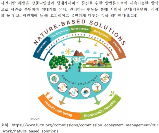 물론 생물들은 새로운 환경과의 충돌, 기존 생태 환경의 교란 등 변화하는 환경에 따라 저항하고, 적응하며, 스스로 회복하는 치유 능력이 있지만, 이는 도시가 회복력(Resilience)을 가지고 있을 때 가능한 이야기다. 이에 도시 환경의 개선과 문제 해결을 위하여 여러 대안들이 제시되고 있는데, 그 중에서도 환경 변화에 대응하는 지속가능한 도시를 만드는 주요한 방법이자 새로운 글로벌 생물다양성 정책의 핵심 개념인 자연기반 해법(Nature based solutions, NBS)에 주목할 필요가 있다.