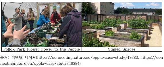 영국의 도시 글래스고는 플록컨트리파크에 자생 야생화를 재배하는 야생화 보육원을 설립하여 시의회, 공원 감시원, 지역 단체 등이 협력하여 운영하고 있고, 글래스고 전역에 있는 많은 유휴지를 팝업가든, 놀이공간과 같은 지역 커뮤니티 공간으로 조성하여 시민들이 이용할 수 있도록 하였다.